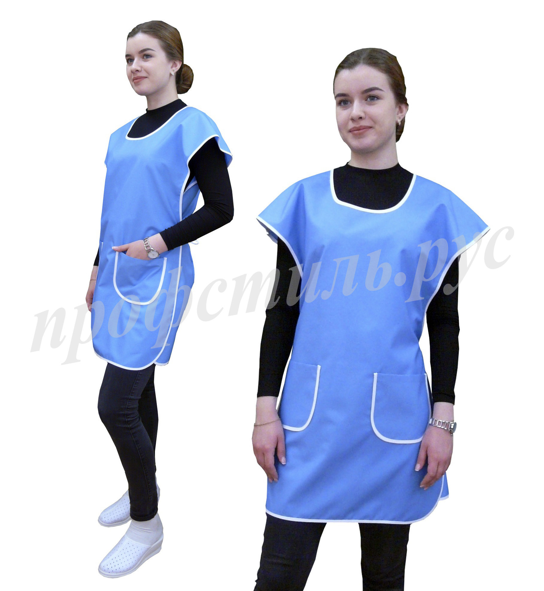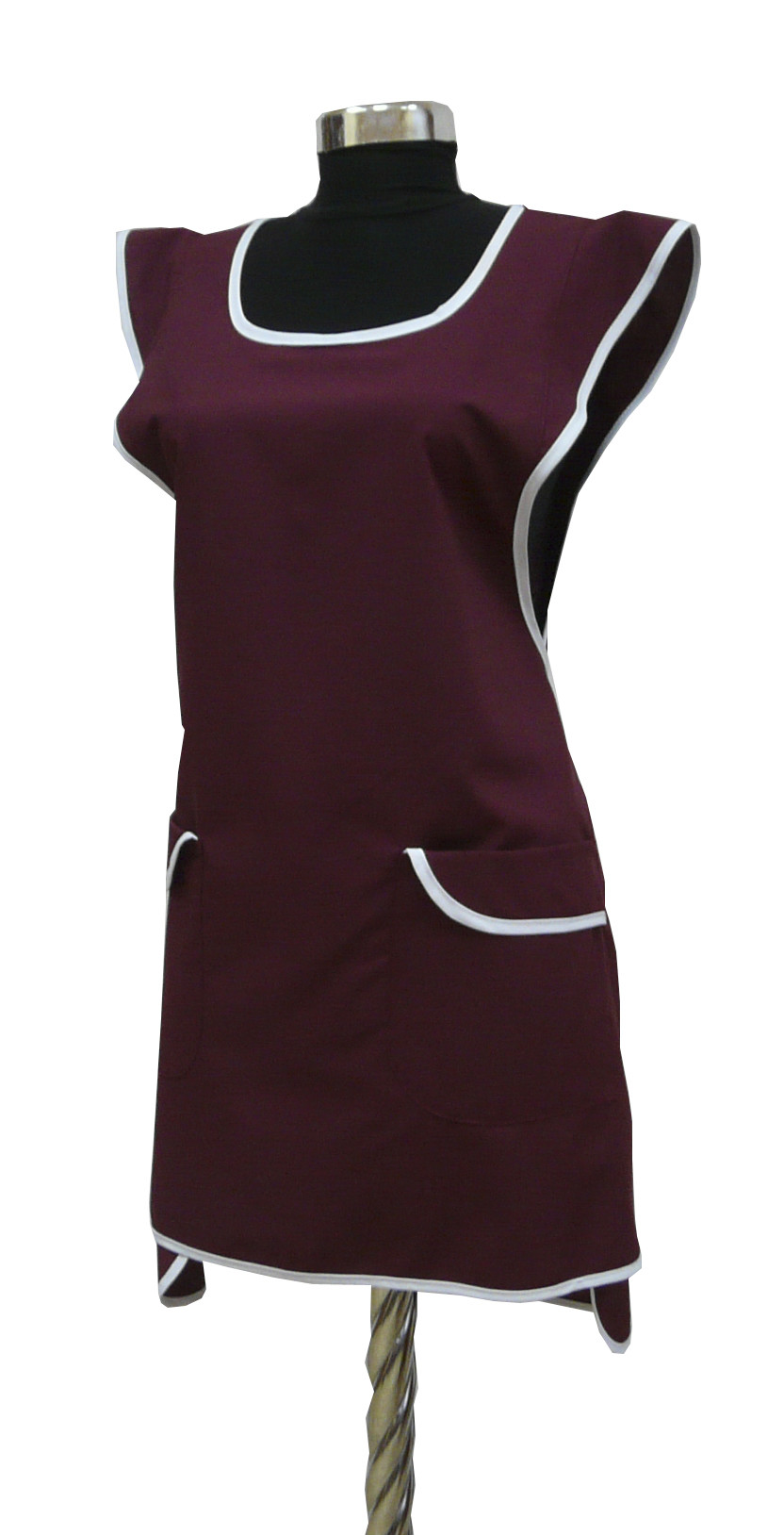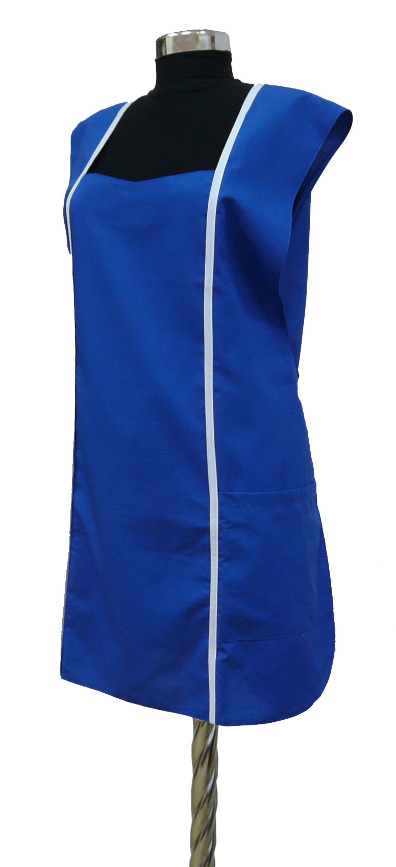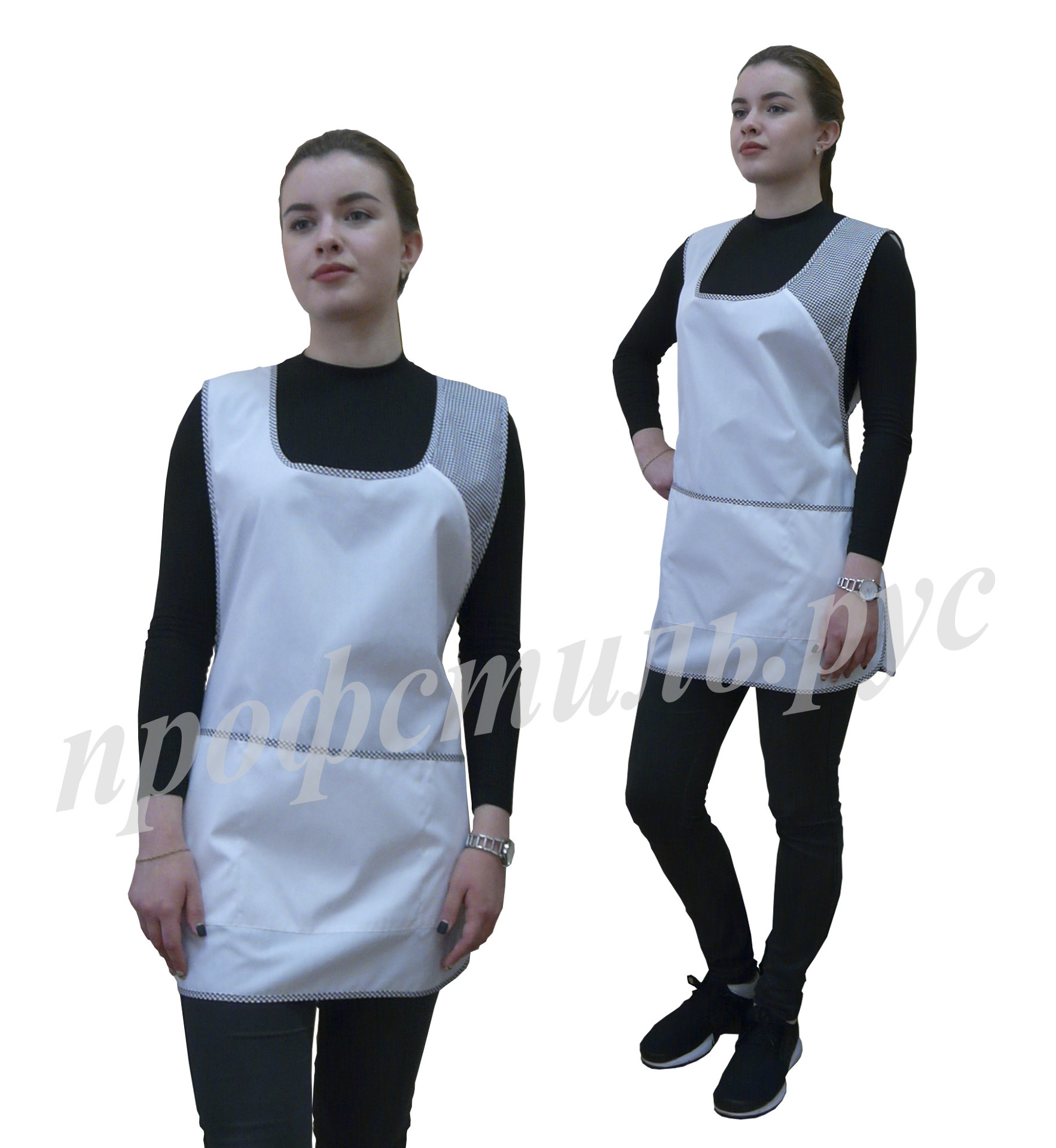 Фартук сервисный с центральной застежкой на петли и пуговицы, с двумя накладными карманами. Модельной особенностью является притачная планка по горловине и борту. Окантовка и некоторые детали изделия могут быть выполнены контрастной отделочной тканью. Без размера. Ткань Сису и Премьер.