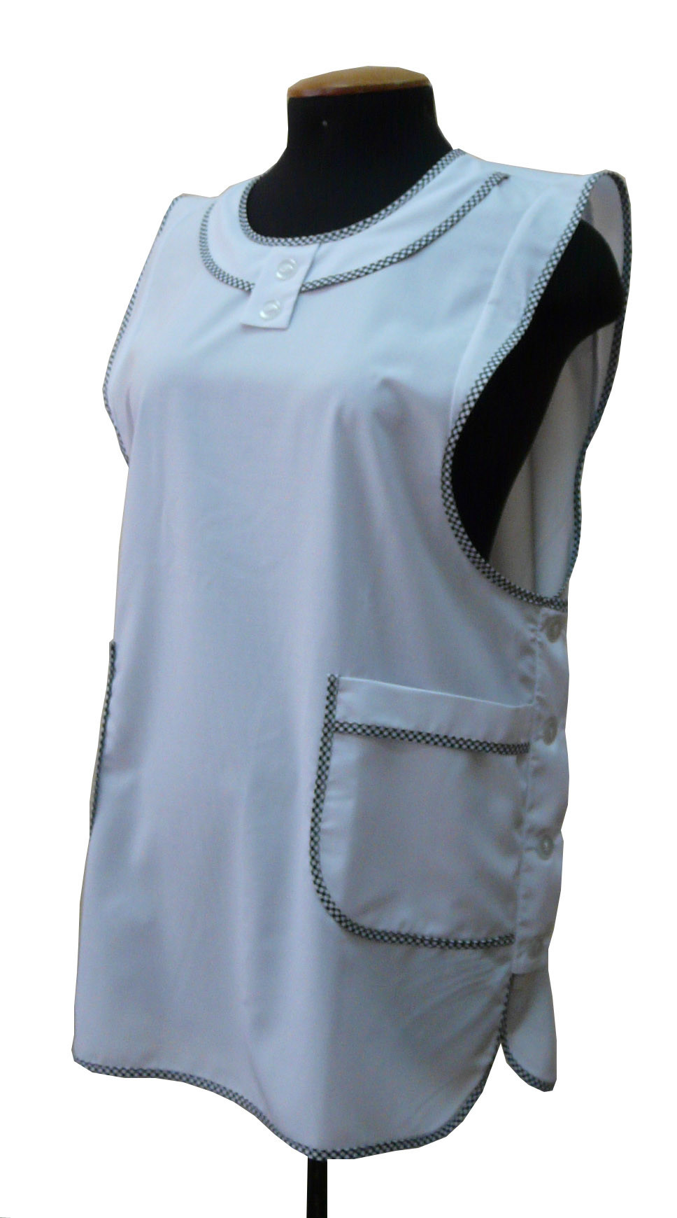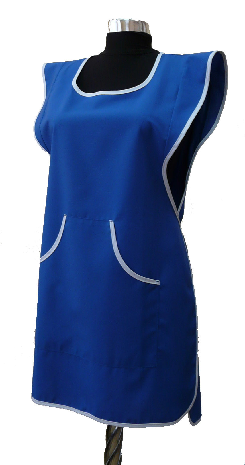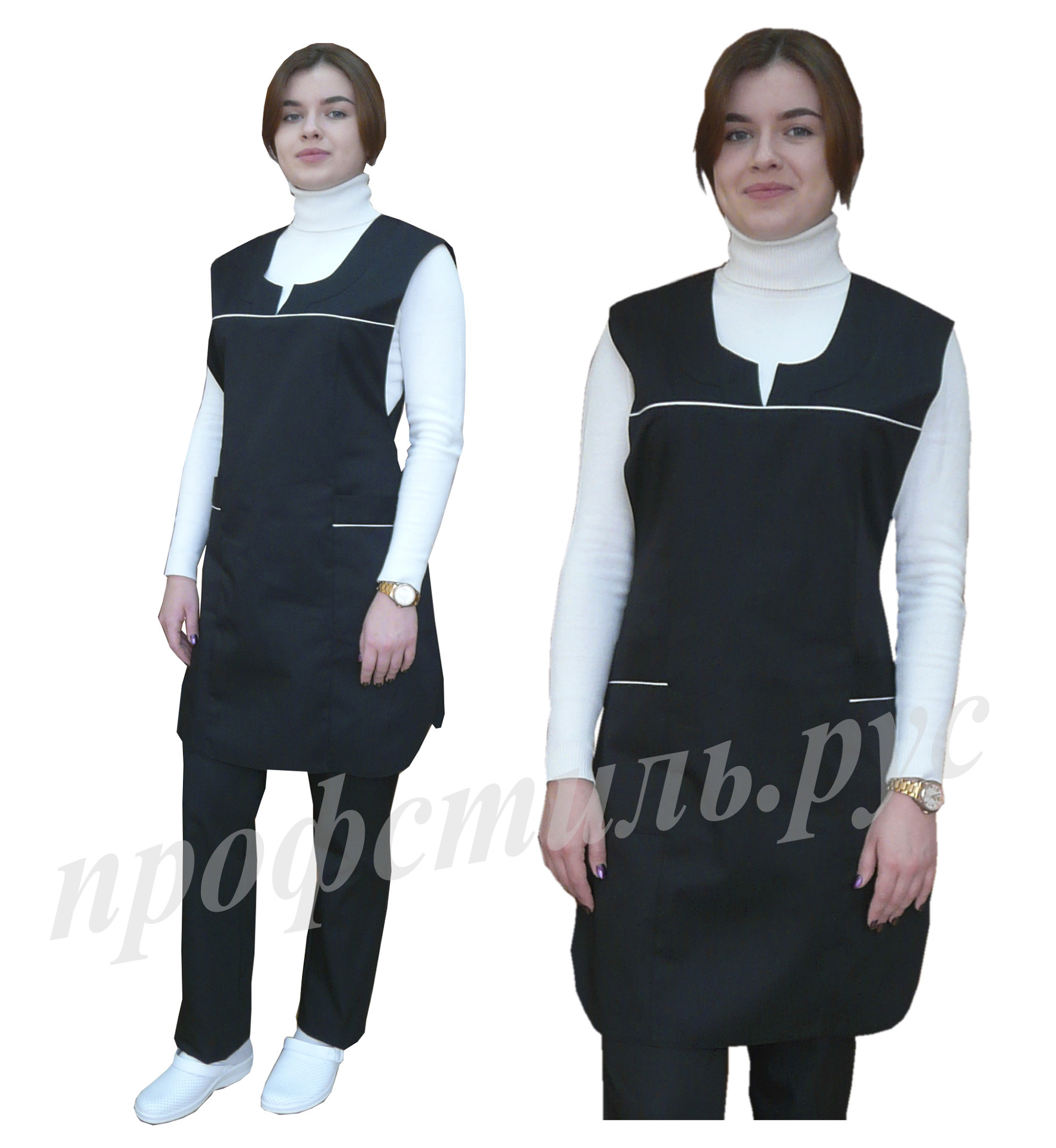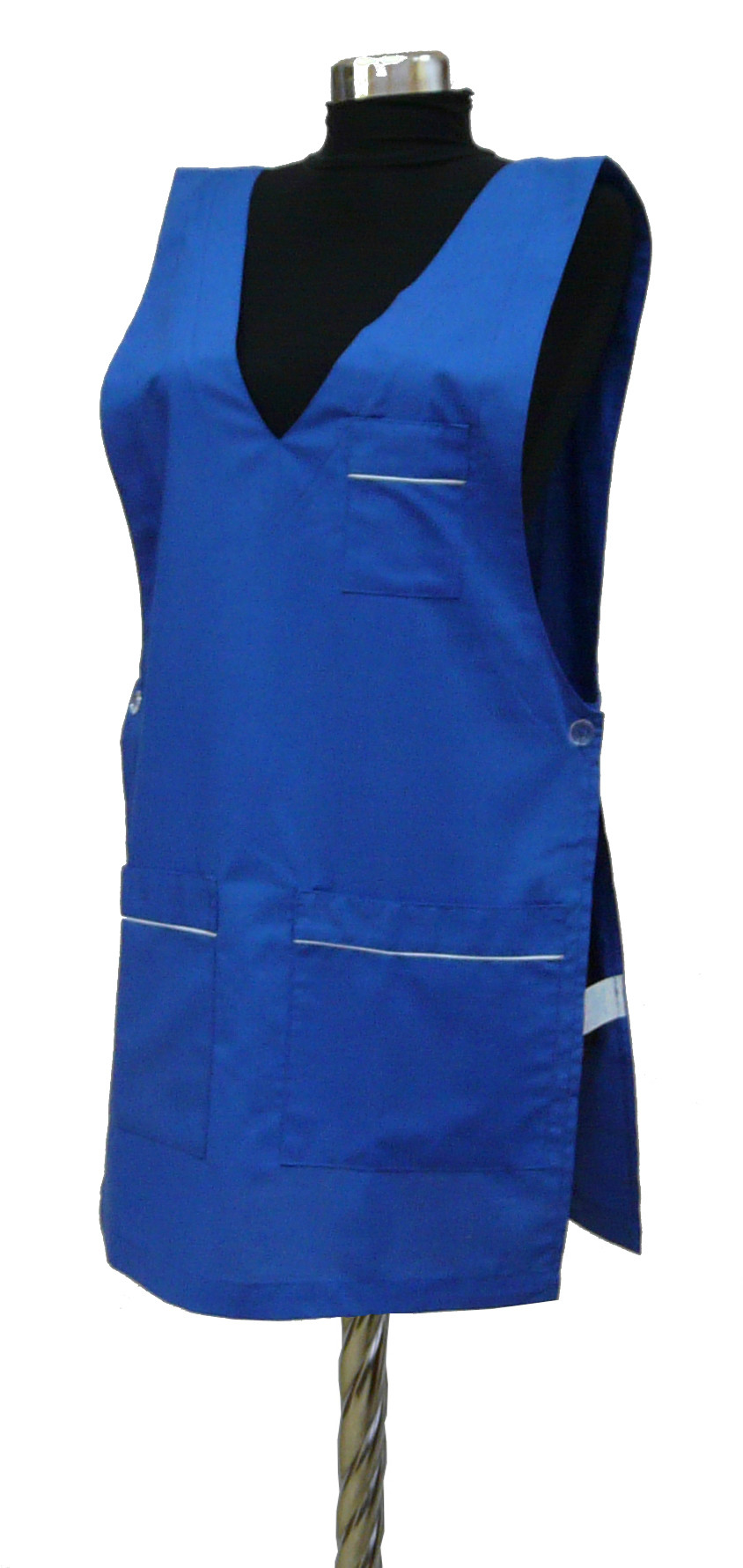 Фартук сервисный с центральной застежкой на петли и пуговицы, с двумя накладными карманами. Модельной особенностью является притачная планка по горловине и борту. Окантовка и некоторые детали изделия могут быть выполнены контрастной отделочной тканью. Без размера. Ткань Сису и Премьер.