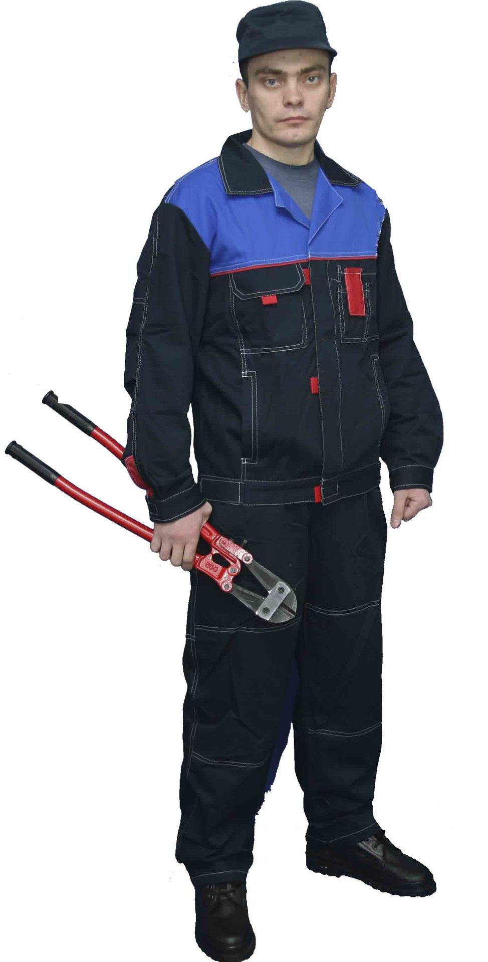 Костюм состоит из куртки и брюк. Брюки без застежки, с притачным поясом с эластичной тесьмой. Изделие с боковыми карманами и накладным на задней половинке брюк. Куртка с двубортной застежкой на петли и пукли. Рукава длиной ¾ с отложными манжетами. Длина рукава регулируется патой. Спинка с рельефами. Воротник – стойка. На левой полочке в верхней части расположен накладной карман. Также карман на левом рукаве. Размер 40-62. Ткань Премьер