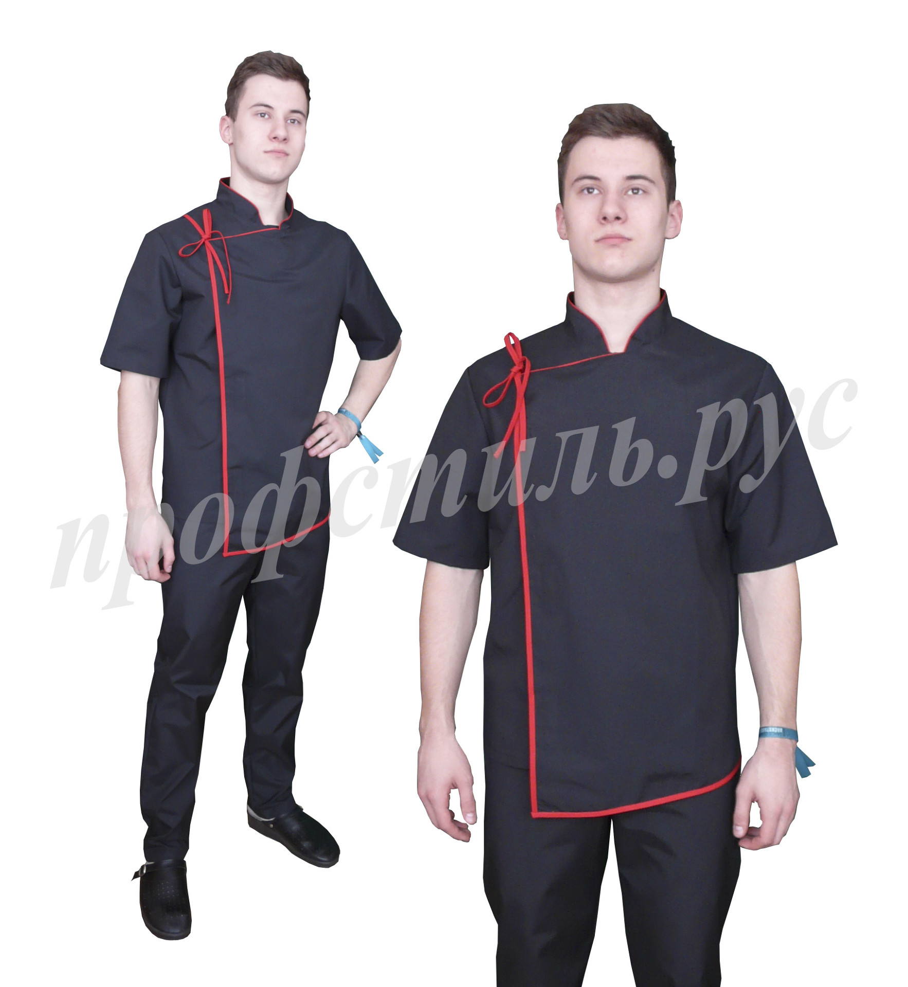 Костюм состоит из куртки и брюк. Брюки без застежки, с притачным поясом с эластичной тесьмой. Куртка с двубортной застежкой на петли и пукли. Рукава длиной ¾ с притачными отложными манжетами. Полочка и спинка с рельефами. Воротник – стойка. На левой полочке в верхней части может быть расположен как накладной, так и прорезной карман. Кант по воротнику, манжетам и борту выполнен из отделочной ткани. Размер 40-62. Ткань Сатори