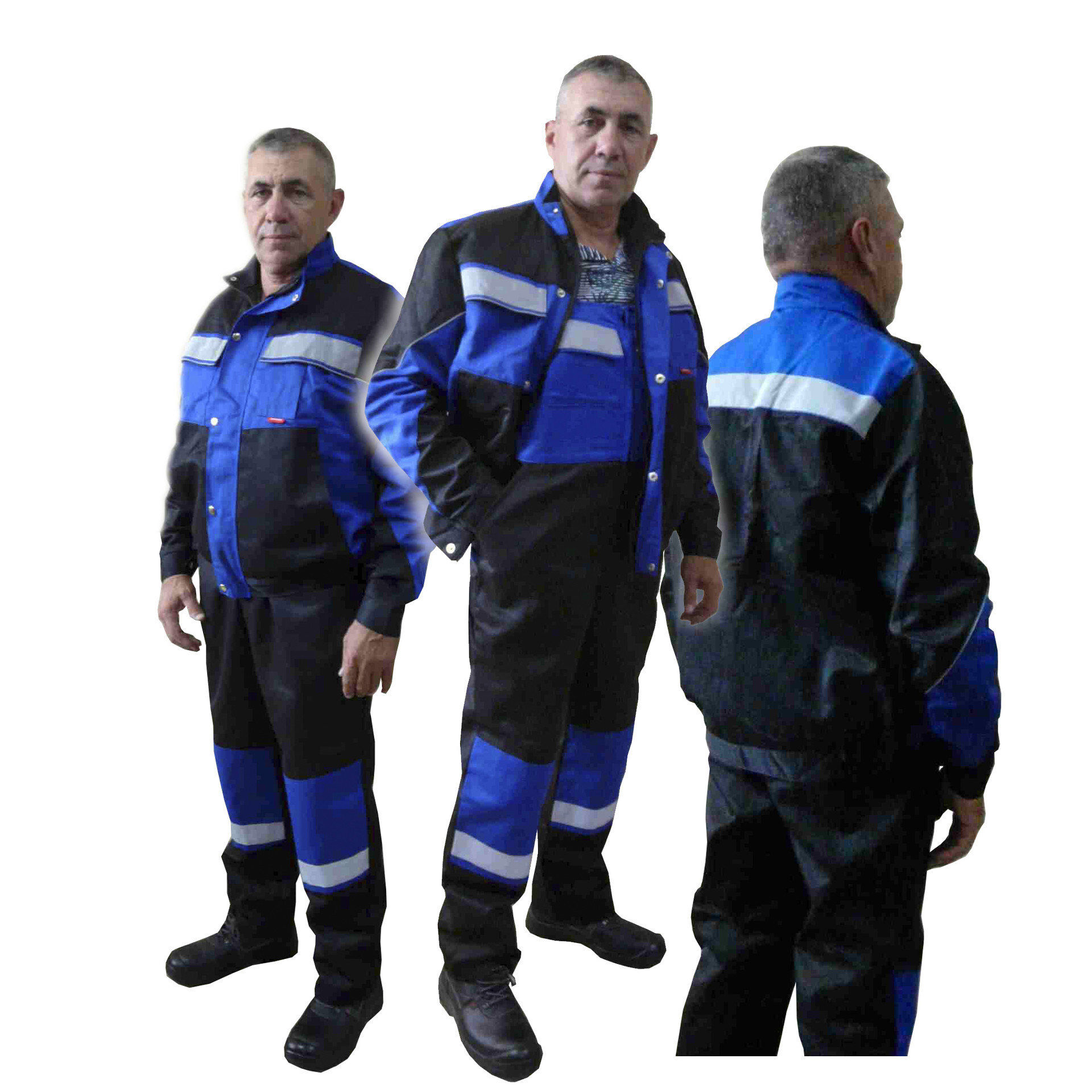Костюм состоит из куртки и брюк. Брюки без застежки, с притачным поясом с эластичной тесьмой. Изделие с боковыми карманами и накладным на задней половинке брюк. Куртка с двубортной застежкой на петли и пуговицы. Рукава длиной ¾ с отложными манжетами. Длина рукава регулируется патой. Спинка с рельефами. Воротник – стойка. На левой полочке в верхней части расположен накладной карман. Также карман расположен на левом рукаве. Размер 40-62. Ткань Сатори
